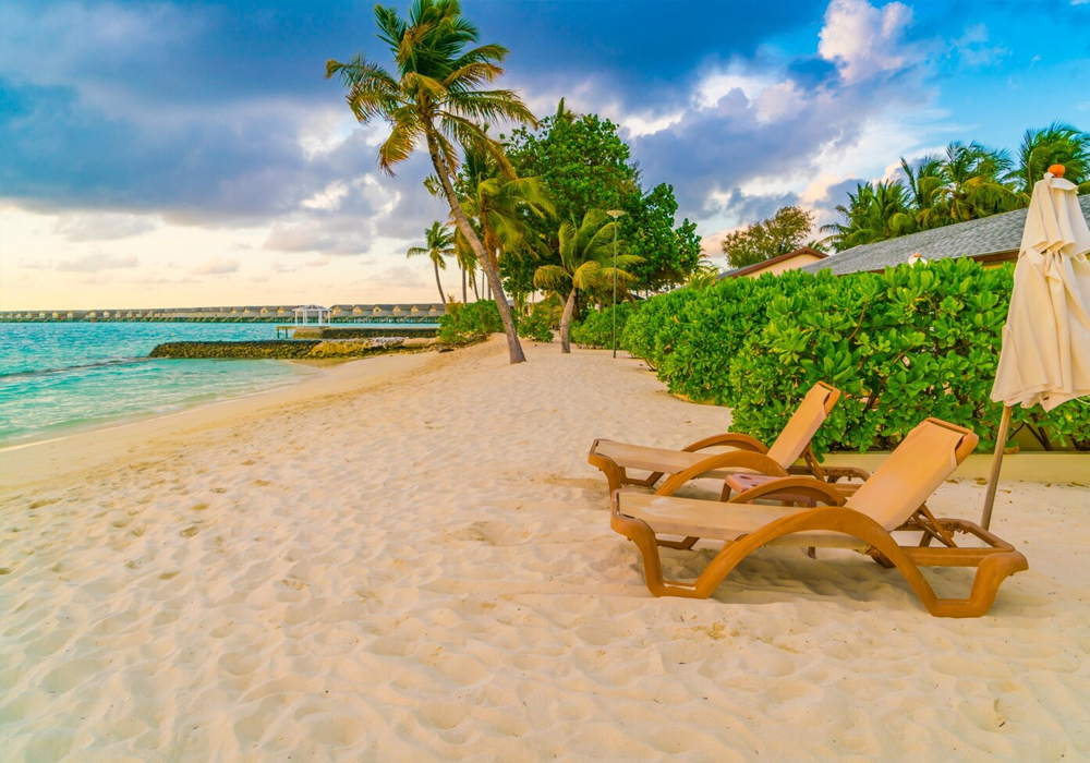 Route: Male → Split stay (Beach Villa + Water Villa) → Excursions → Male